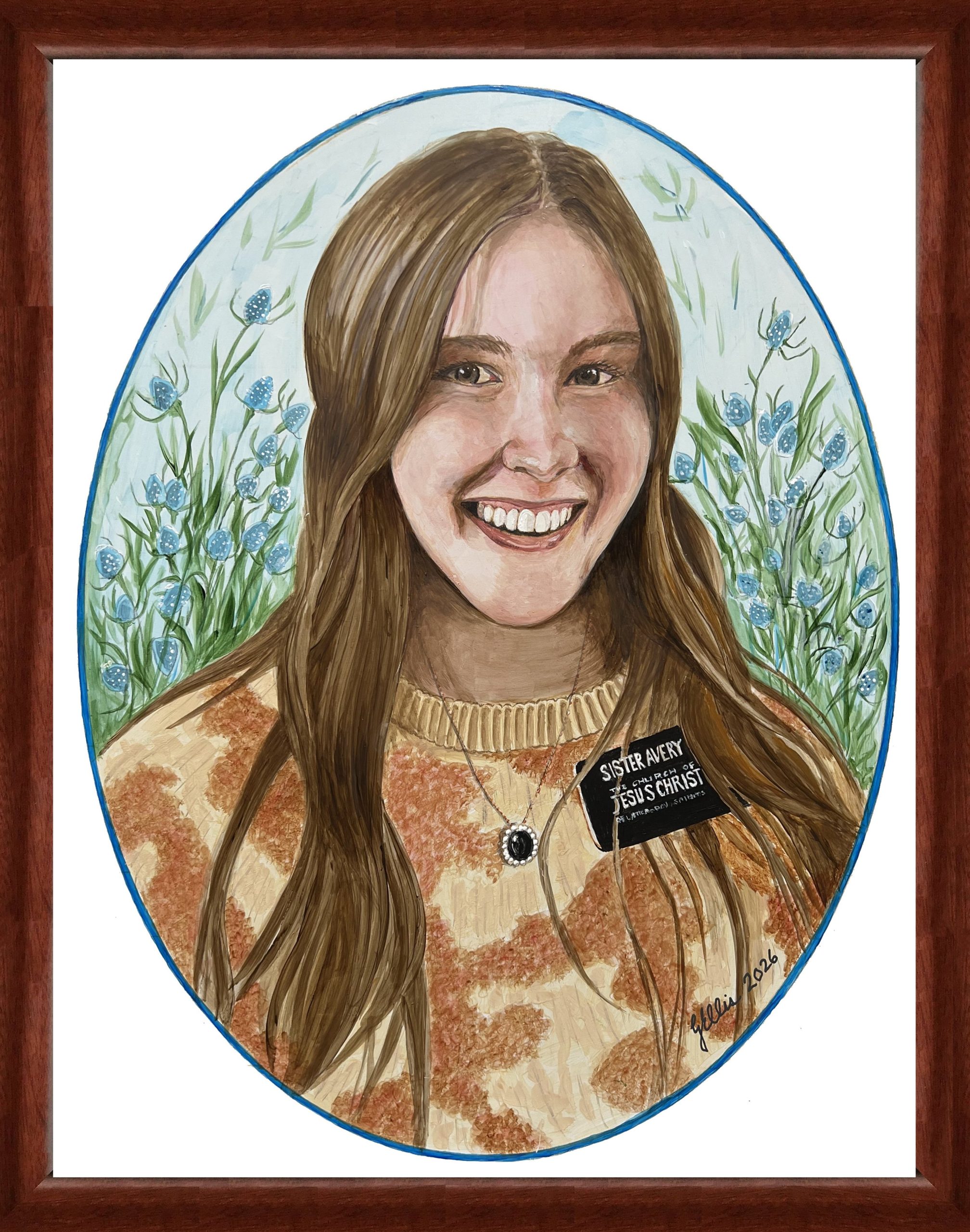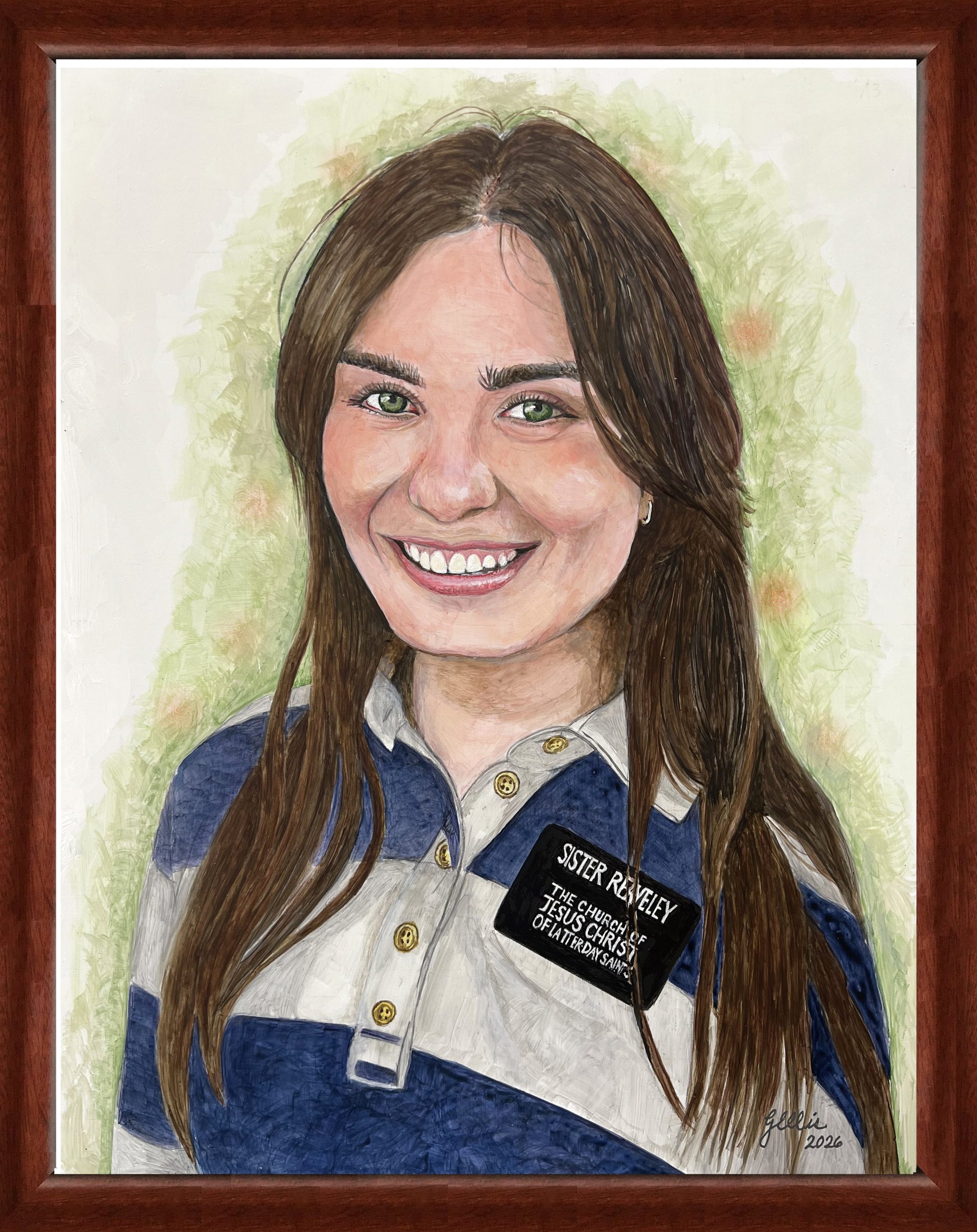 by Godfrey J. Ellis – 8×14 Acrylic March 2026 Another of our lovely sister missionaries working in the Lacey area. She has been here for several months. She wanted blue flowers in the background. Below is the reference photo. Here is a photo of the real Sister Avery holding her portrait, which she much appreciated. […]