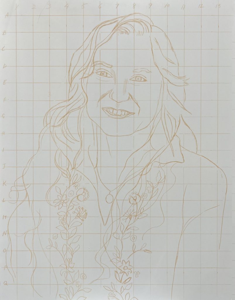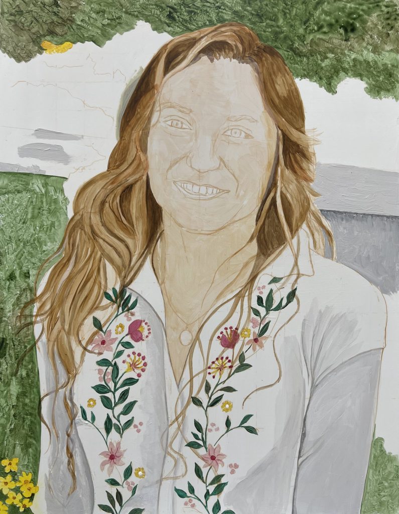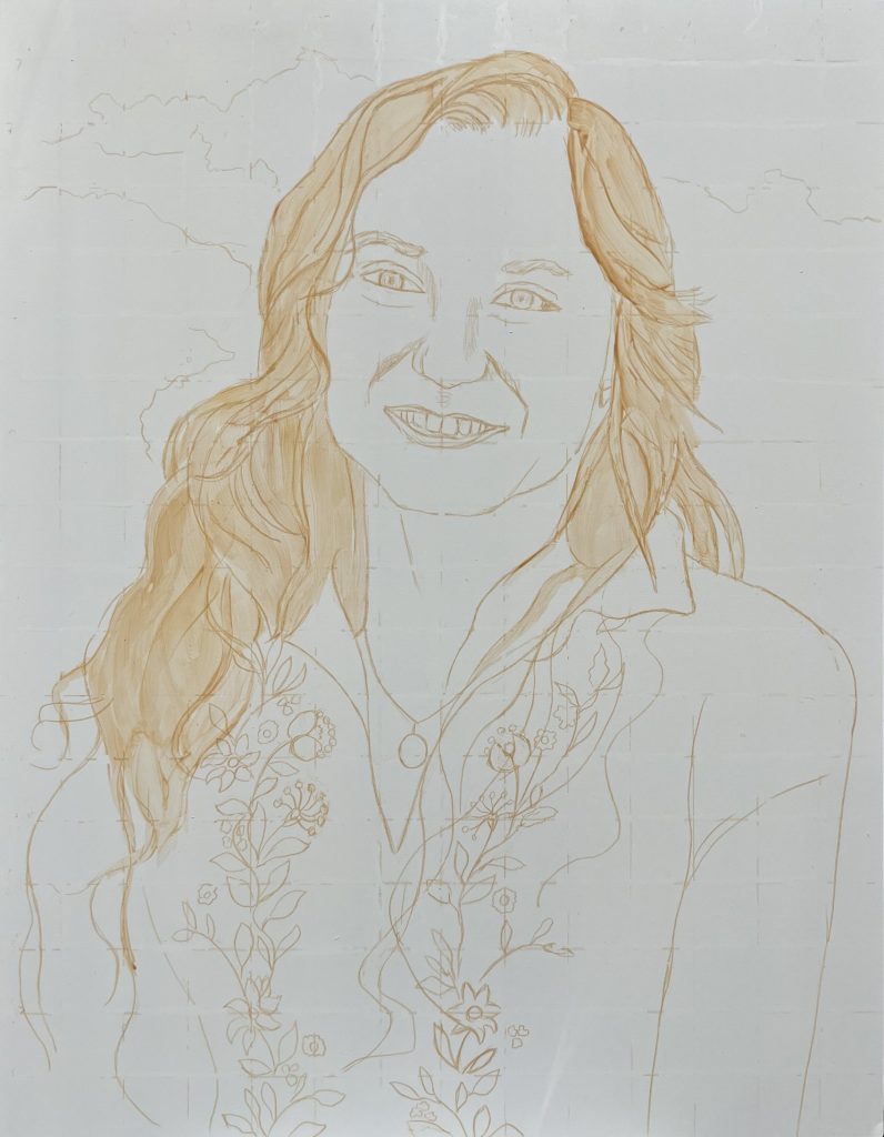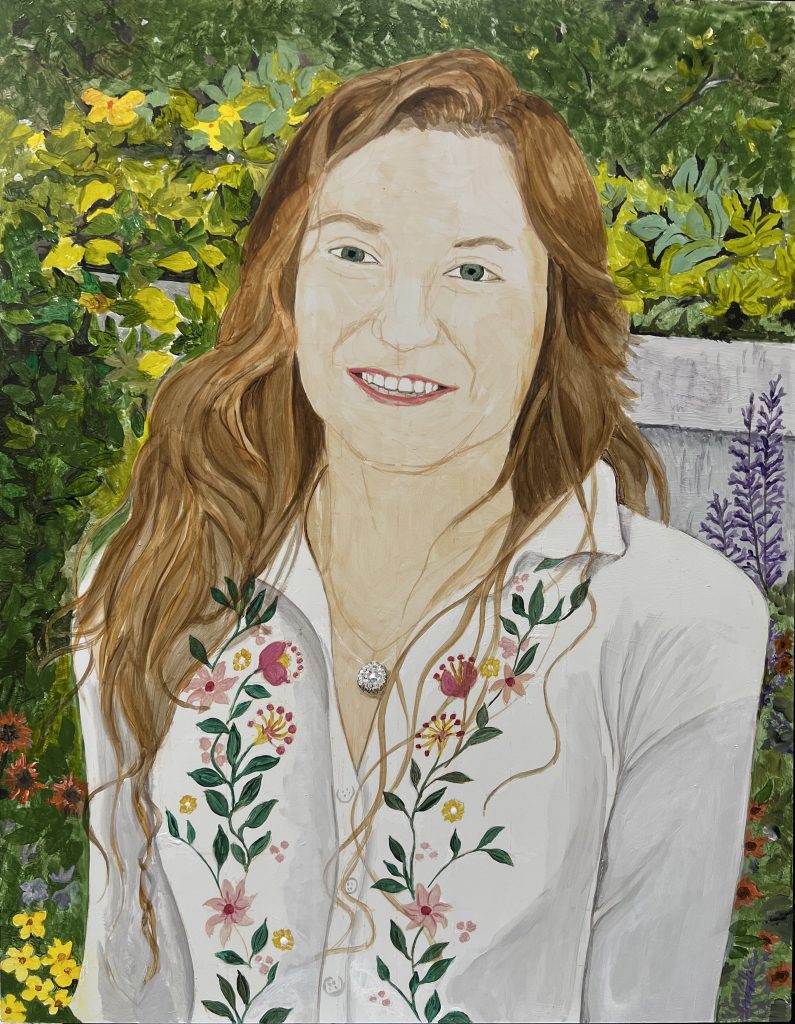 Most portraits go through an “awkward phase” and often the artist feels like giving up and starting again. That usually passes quickly; this one didn’t. It lasted longer than usual. I worked and worked on it and it finally passed through into the finished phase. That’s not to say it is perfect and there are a few things I would like to change. Nevertheless, it is the best I can do at this stage of my development as a portrait artist. Below is a photo of her holding it.