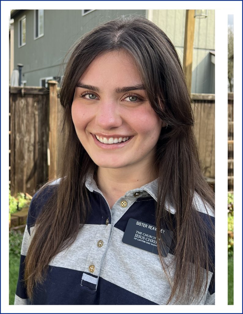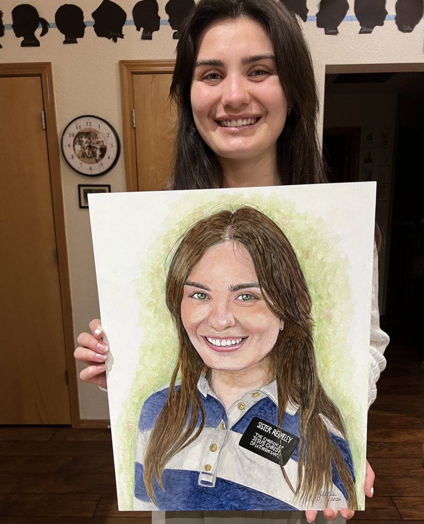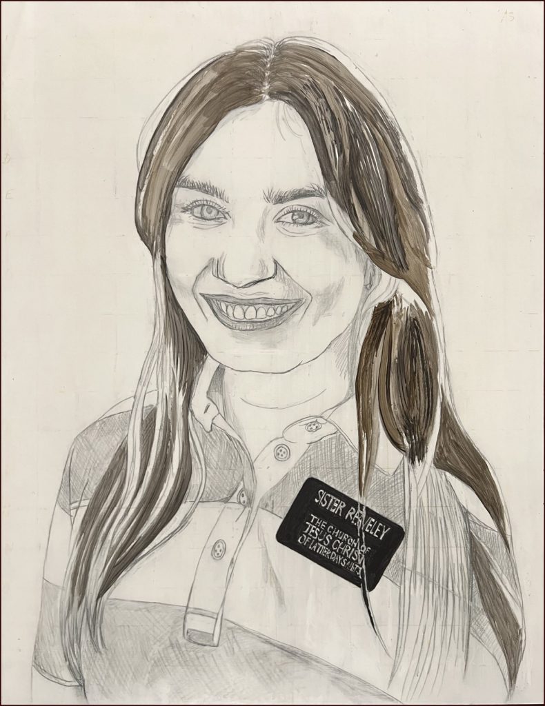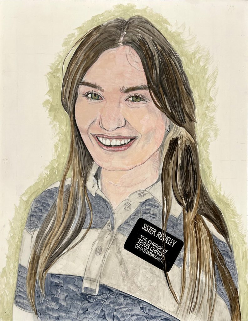 Yet another of our lovely and hard-working sister missionaries. The reference photo was very good and a good photo goes a long way to producing a good painting. I especially enjoyed painting her beautiful, sparkly green eyes. She likes flowers but agreed that, with the simple top she was wearing, we didn’t want flowers to upstage her. Instead, we wanted the focus on her face. I put in spots of red in the green outline to suggest the flowers.