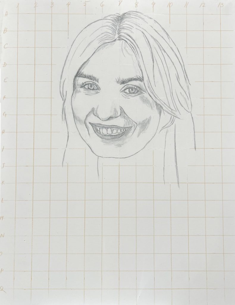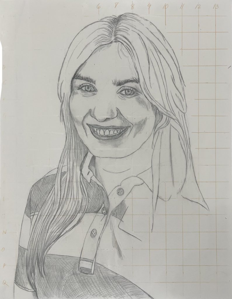 The reference photo was very good and a good photo goes a long way to producing a good painting. I especially enjoyed painting her beautiful, sparkly green eyes. Below is a photo of her holding the portrait (in different lighting).