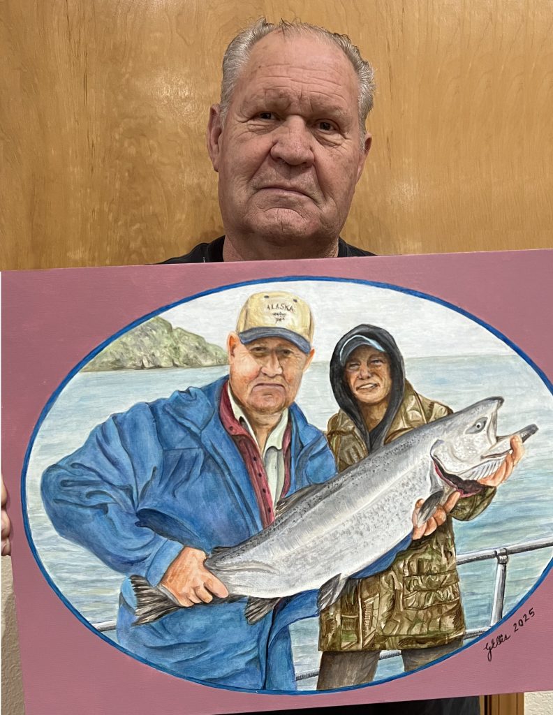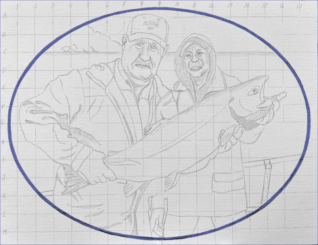 The reference photo is just a snapshot of a King Salmon he had caught on a trip to Alaska. I initially thought the other man was his son, but later learned that it was a deckhand who was a good friend.
