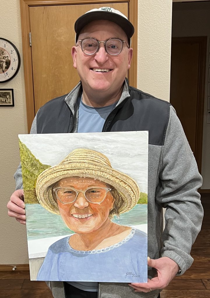 Happily, the husband who commission this as a Christmas gift for his wife loved it. He paid more than we originally agreed and has others he would like me to paint. So, that’s good! Below is a photo of him holding the portrait.